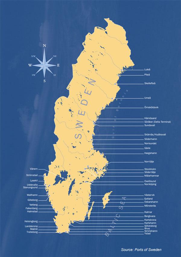 Kaart van Zweden poorten. Zweden poorten kaart (Noord-Europa - Europa) af te drukken. Zweden poorten kaart (Noord-Europa - Europa) te downloaden. Göteborg, Stockholm en Malmö, de drie grootste havens, en een aantal kleinere havens zijn goed uitgerust om grote zeeschepen te behandelen. In 2005 bestond de Zweedse koopvaardijvloot uit 205 schepen van 1.000 BRT of meer, met een totale capaciteit van 2.702.763 BRT. Kanalen in Midden-Zweden hebben de meren opengesteld voor zeeschepen; de binnenwateren zijn in totaal 2.052 km lang en bevaarbaar voor kleine stoomschepen en binnenschepen. In 2018 was Göteborg de Zweedse haven die het grootste volume aan goederen behandelde, zoals te zien is op de havenkaart van Zweden. In detail kwam er dat jaar meer dan 40,6 miljoen ton goederen de haven binnen. De tweede drukste haven was Trelleborg met meer dan 11 miljoen ton behandelde goederen.